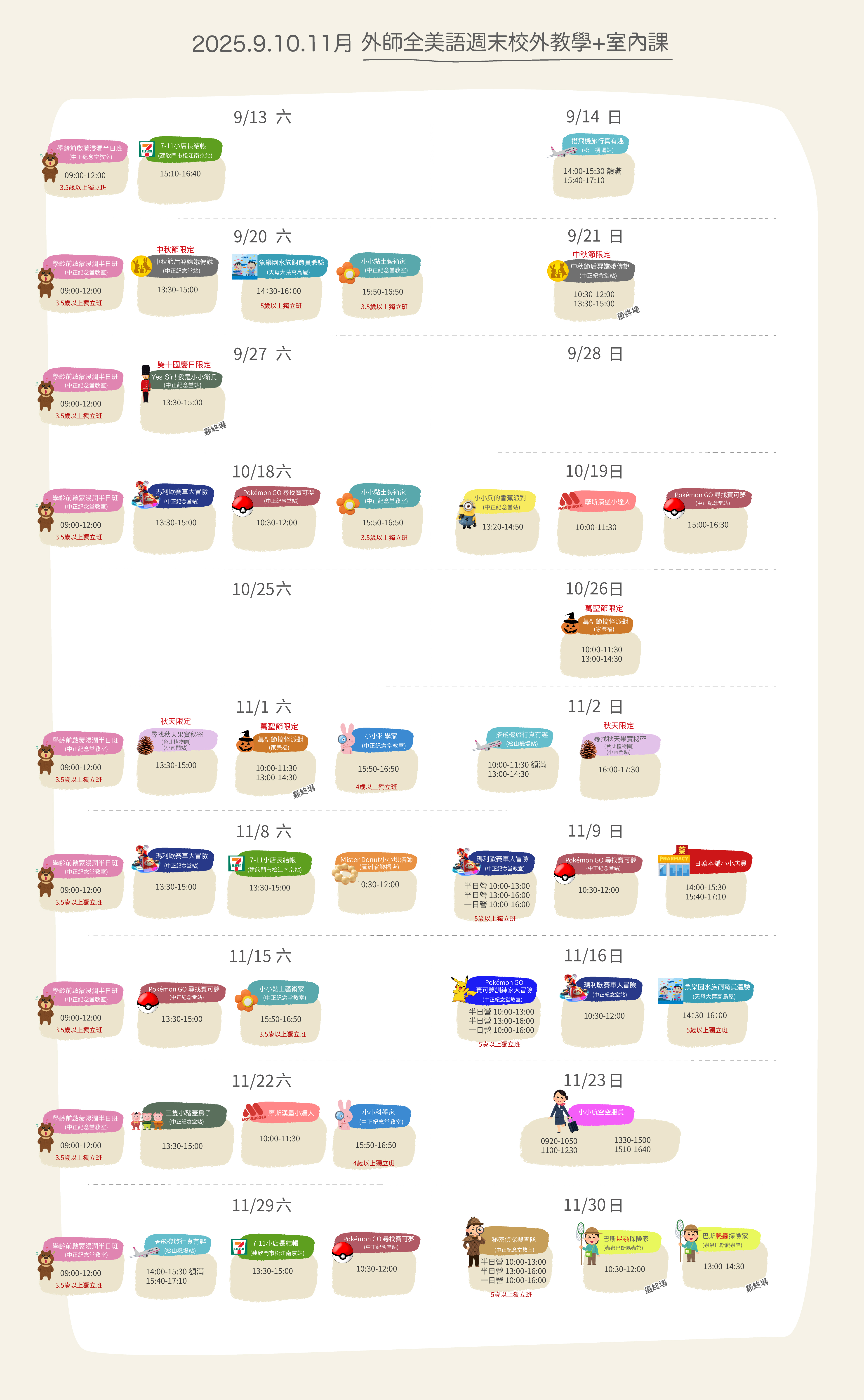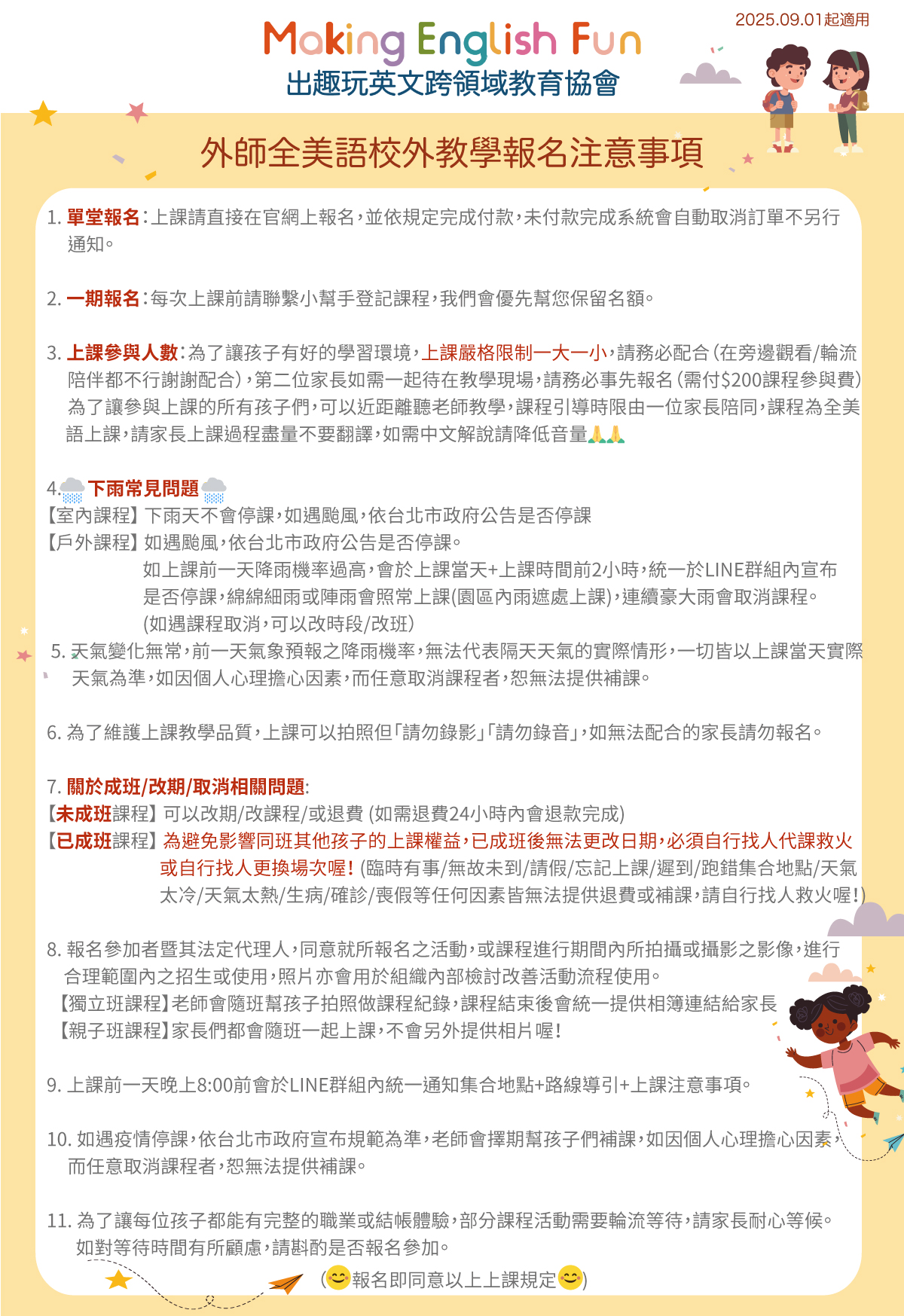 6、包班優惠:滿10人可包班,請由一位代表付款,包班優惠$700/一大一小 (原價$950),即包班總優惠金額$2500,若有場地費/餐飲費等另計,可以自選上課日期與主題,與熟識的家長孩子們一起開心參與活動,學習氛圍更熱烈。包班請聯繫小幫手,看更多包班推薦課程與費用