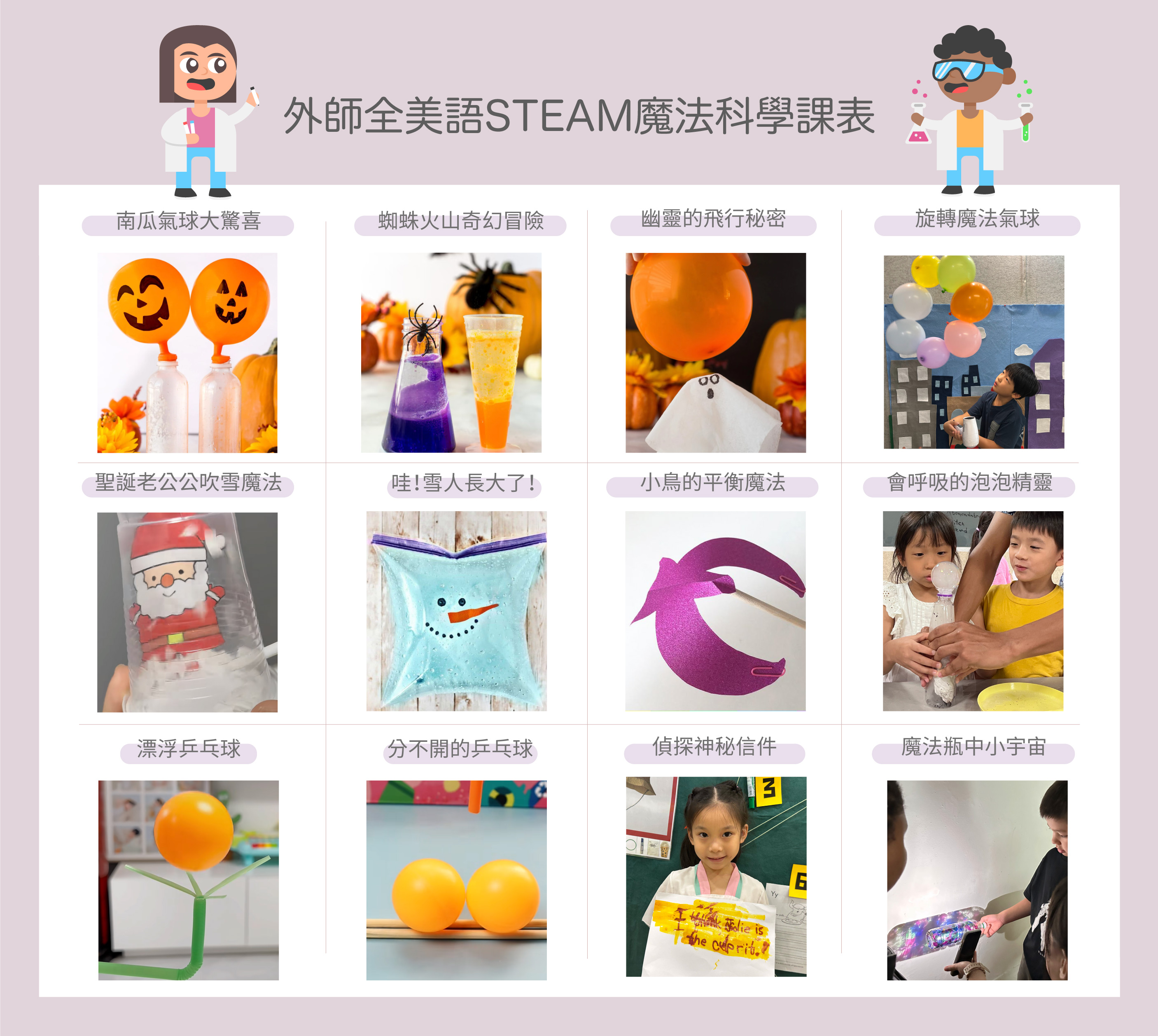 11/1(六) 南瓜氣球大驚喜+蜘蛛火山奇幻冒險 11/15(六) 幽靈的飛行秘密+轉圈魔法氣球 11/29(六) 偵探神祕信件+魔法瓶中小宇宙 12/20(六) 聖誕老公公吹雪魔法+哇!雪人長大了! 12/13(六) 小鳥的平衡魔法 + 會呼吸的泡泡精靈 12/27(六) 聖誕老公公吹雪魔法 + 哇 ! 雪人長大了 !