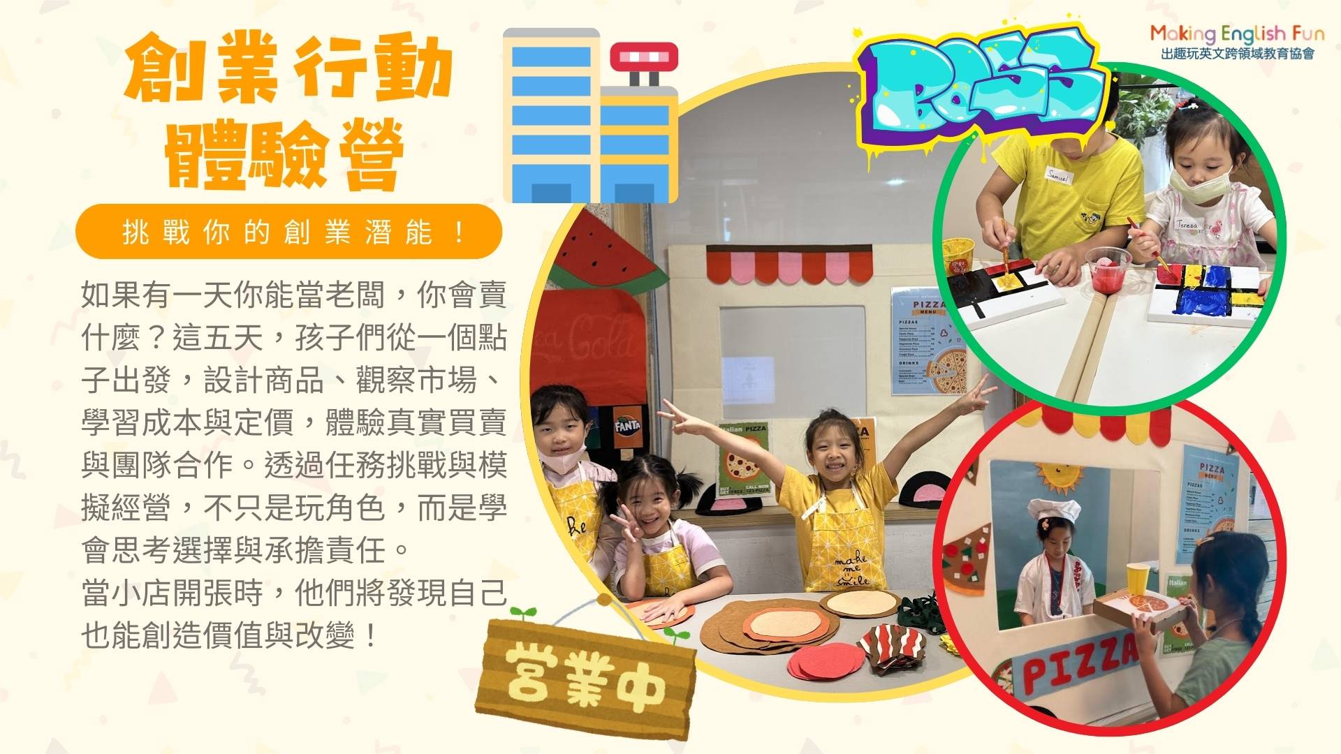 如果有一天你能當老闆,你會賣什麼?這五天,孩子們從一個點子出發,設計商品、觀察市場、學習成本與定價,體驗真實買賣與團隊合作。透過任務挑戰與模擬經營,不只是玩角色,而是學會思考選擇與承擔責任。當小店開張時,他們將發現自己也能創造價值與改變!