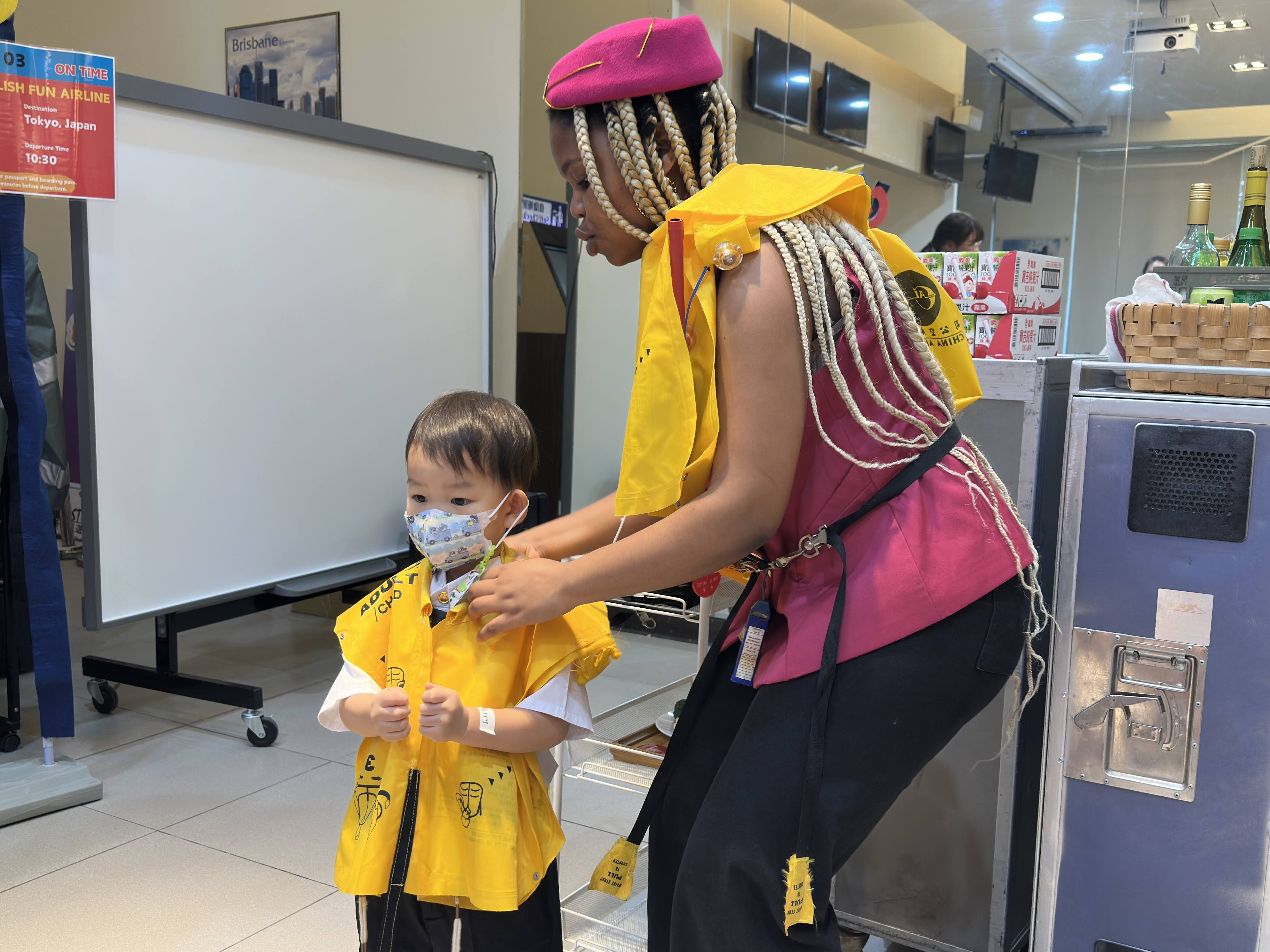 在小小空服員課程中,孩子們跟隨老師學習飛行服務流程,模擬迎賓、發放飲料及講解安全規則。透過角色扮演與情境互動,孩子們提升語言表達、自信心與團隊協作能力,快樂學習中了解空服員的專業日常。